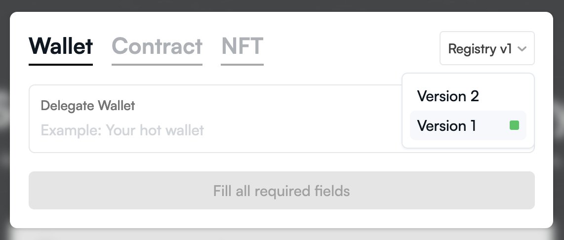 Users who wish to continue managing their V1 registry delegations can do so by using the version selector in the top right corner of the delegation modal.